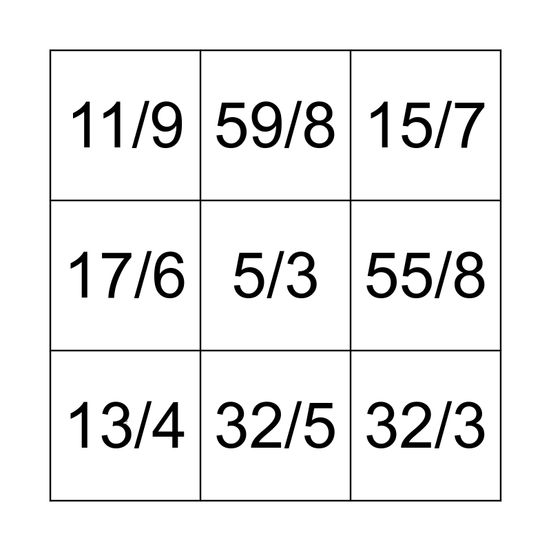 This bingo card has 1 images and 9 words: 13/4, 15/7, 59/8, 17/6, 11/9, 55/8, 5/3, 32/3 and 32/5.