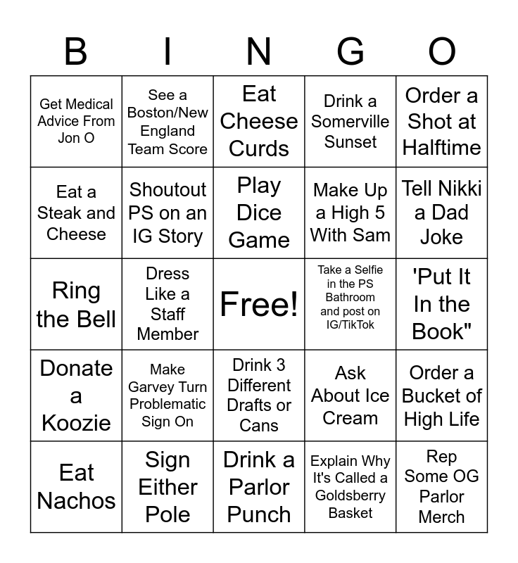 This bingo card has a free space and 25 words: Eat Nachos, Make Garvey Turn Problematic Sign On, Play Dice Game, Explain Why It's Called a Goldsberry Basket, Tell Nikki a Dad Joke, Get Medical Advice From Jon O, See a Boston/New England Team Score, Eat Cheese Curds, Make Up a High 5 With Sam, Order a Bucket of High Life, Ring the Bell, Shoutout PS on an IG Story, Ask About Ice Cream, Rep Some OG Parlor Merch, Eat a Steak and Cheese, Sign Either Pole, Drink a Parlor Punch, Drink a Somerville Sunset, 'Put It In the Book", Donate a Koozie, Dress Like a Staff Member, Drink 3 Different Drafts or Cans, Take a Selfie in the PS Bathroom and post on IG/TikTok, Order a Shot at Halftime and Buy New PS Swag.