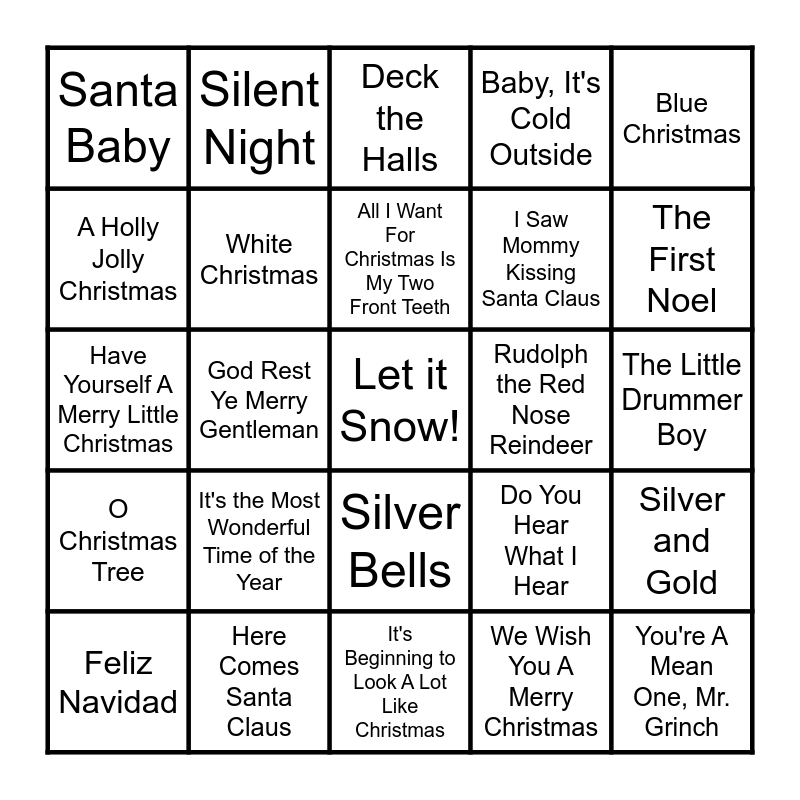 This bingo card has a free space and 34 words: Jingle Bells, We Wish You A Merry Christmas, O Holy Night, Carol of the Bells, O Christmas Tree, White Christmas, Blue Christmas, Feliz Navidad, Silent Night, Hark! The Herald Angels Sing, All I Want For Christmas Is My Two Front Teeth, Deck the Halls, Jingle Bells Rock, Santa Baby, Rudolph the Red Nose Reindeer, The First Noel, Here Comes Santa Claus, Have Yourself A Merry Little Christmas, It's the Most Wonderful Time of the Year, Do You Hear What I Hear, Silver Bells, Rockin' Around the Christmas Tree, Santa Baby, The Little Drummer Boy, It's Beginning to Look A Lot Like Christmas, You're A Mean One, Mr. Grinch, Baby, It's Cold Outside, Frosty the Snowman, I Saw Mommy Kissing Santa Claus, A Holly Jolly Christmas, The Twelve Days of Christmas, God Rest Ye Merry Gentleman, Silver and Gold and O Come All Ye Faithful.