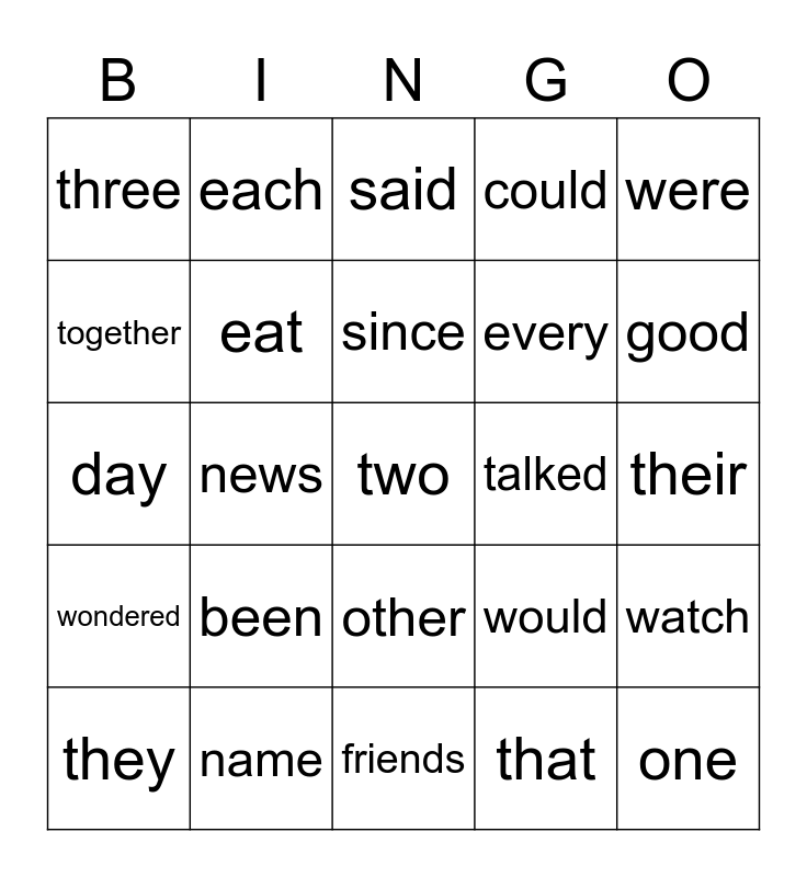 This bingo card has 25 words: been, friends, since, they, were, three, together, each, talked, other, every, day, would, watch, eat, one, their, said, good, news, two, name, wondered, could and that.