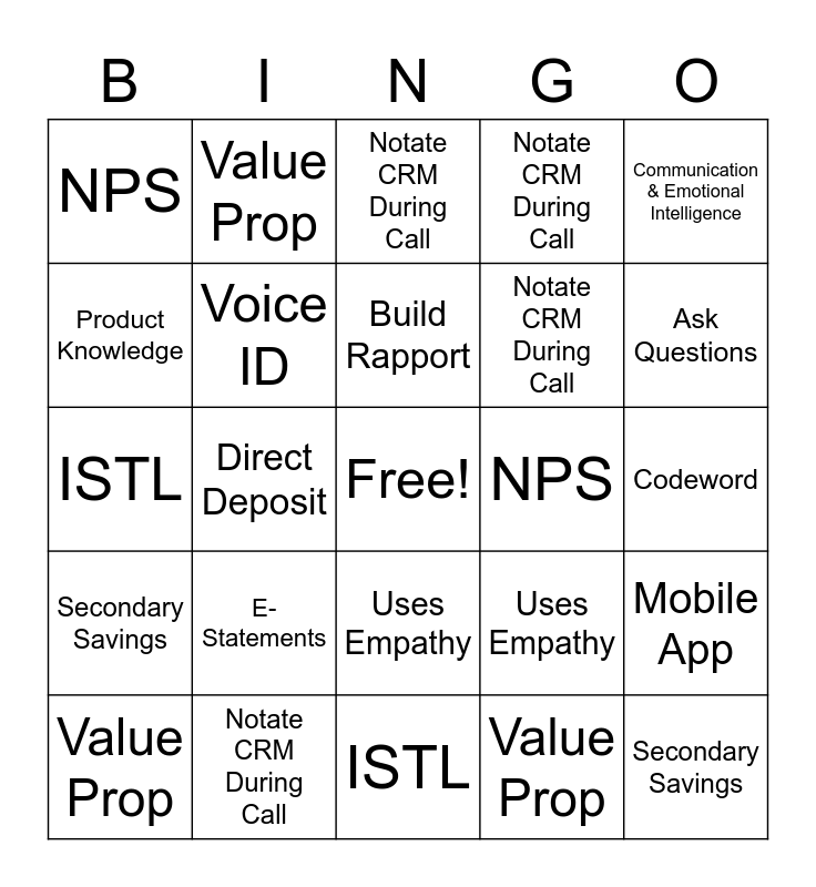 This bingo card has a free space and 72 words: NPS, Value Prop, Direct Deposit, Loan Referral, NPS, NPS, Notate CRM During Call, Alerts, Notate CRM During Call, Build Rapport, Value Prop, BillPay, Ask Questions, NPS, Product Knowledge, ISTL, Uses Empathy, Communication & Emotional Intelligence, Voice ID, Codeword, E-Statements, Secondary Savings, Mobile App, AutoPay, NPS, Value Prop, Direct Deposit, Loan Referral, NPS, NPS, Notate CRM During Call, Alerts, Notate CRM During Call, Build Rapport, Value Prop, BillPay, Ask Questions, NPS, Product Knowledge, ISTL, Uses Empathy, Communication & Emotional Intelligence, Voice ID, Codeword, E-Statements, Secondary Savings, Mobile App, AutoPay, NPS, Value Prop, Direct Deposit, Loan Referral, NPS, NPS, Notate CRM During Call, Alerts, Notate CRM During Call, Build Rapport, Value Prop, BillPay, Ask Questions, NPS, Product Knowledge, ISTL, Uses Empathy, Communication & Emotional Intelligence, Voice ID, Codeword, Direct Deposit, Secondary Savings, Mobile App and AutoPay.