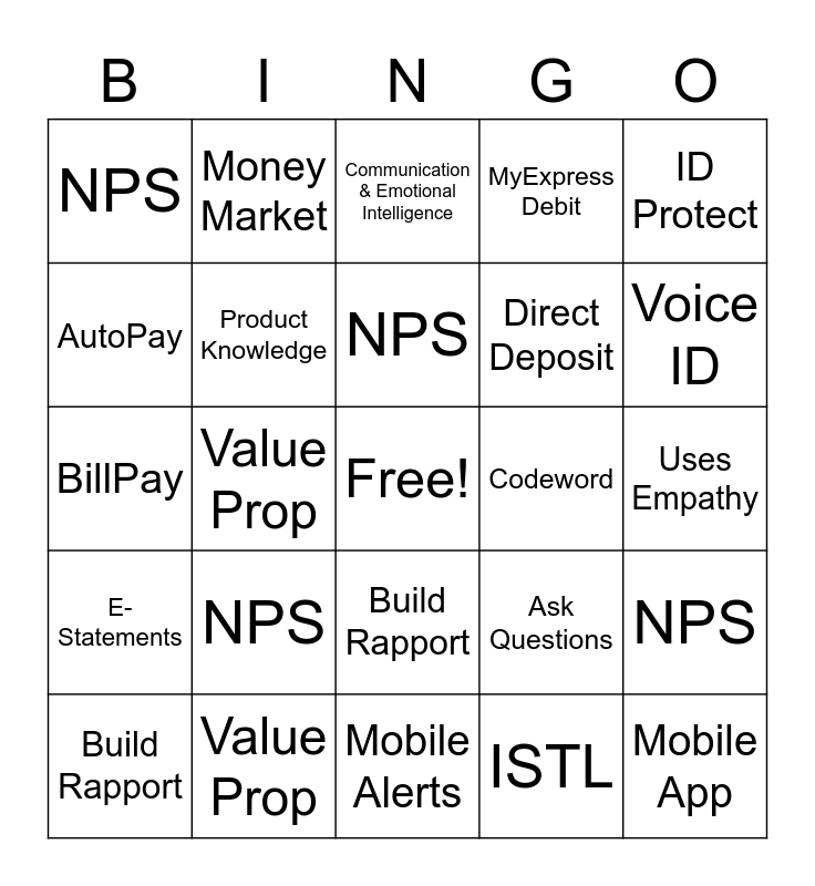This bingo card has a free space and 24 words: NPS, Value Prop, NPS, Build Rapport, ID Protect, NPS, AutoPay, Money Market, Codeword, Build Rapport, Direct Deposit, BillPay, Ask Questions, NPS, Product Knowledge, ISTL, Uses Empathy, Communication & Emotional Intelligence, Voice ID, Value Prop, Mobile App, E-Statements, MyExpress Debit and Mobile Alerts.