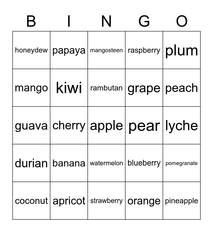 This bingo card has a free space and 24 words: banana, apricot, rambutan, coconut, plum, honeydew, mango, papaya, pear, watermelon, grape, guava, blueberry, pomegranate, kiwi, orange, lyche, mangosteen, peach, cherry, pineapple, durian, raspberry and strawberry.