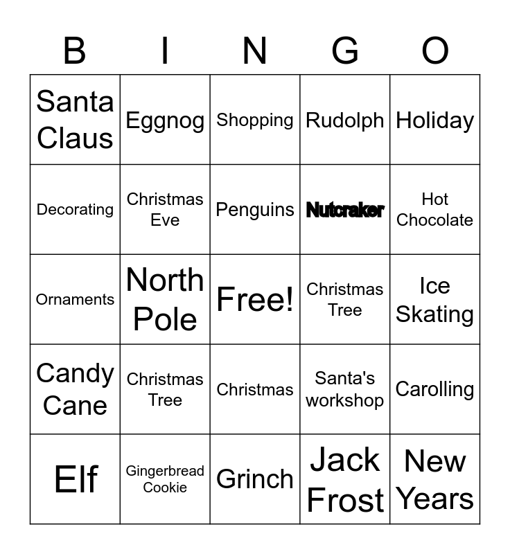 This bingo card has a free space and 26 words: Christmas, Jack Frost, Penguins, Gingerbread Cookie, Holiday, Santa Claus, Decorating, Eggnog, Ice Skating, Santa's workshop, Nutcraker, Ornaments, Carolling, Elf, North Pole, Gifts, Rudolph, Candy Cane, Shopping, New Years, Hot Chocolate, Grinch, Christmas Tree, Christmas Tree, Christmas Eve and Christmas Day.