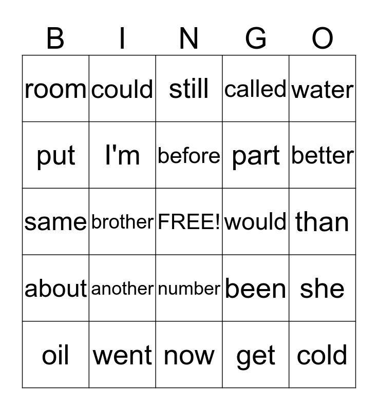 This bingo card has a free space and 24 words: another, went, before, oil, water, room, put, could, would, number, part, same, been, she, I'm, get, than, still, better, brother, cold, about, called and now.