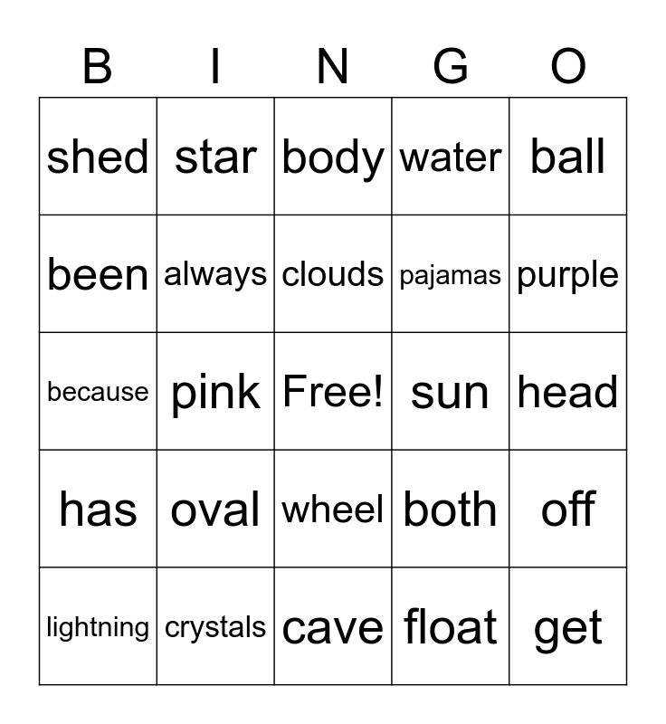 This bingo card has a free space and 24 words: oval, crystals, clouds, lightning, ball, shed, been, star, sun, wheel, pajamas, because, both, off, always, float, head, body, purple, pink, get, has, water and cave.