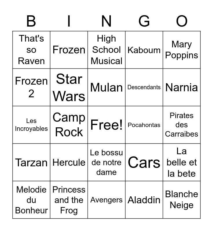 This bingo card has a free space and 42 words: La petite sirene, Mulan, Le Roi Lion, Hercule, Aladdin, La belle et la bete, Blanche Neige, Cendrillon, High School Musical, Le bossu de notre dame, Pirates des Carraibes, Narnia, Camp Rock, Mary Poppins, Coco, Cars, Histoire de jouet, Les Incroyables, Moana, Frozen, Frozen 2, Spirit, Lilo et Stitch, That's so Raven, Hanna Montana, Raiponce, Descendants, Peter Pan, The Suite Life of Zack and Cody, Jessie, Mon frere l'ours, Tarzan, Star Wars, Avengers, Sister Act 2, Melodie du Bonheur, Princess and the Frog, Pocahontas, Prince d'Egypte, Wall-E, Kaboum and Melodilous.