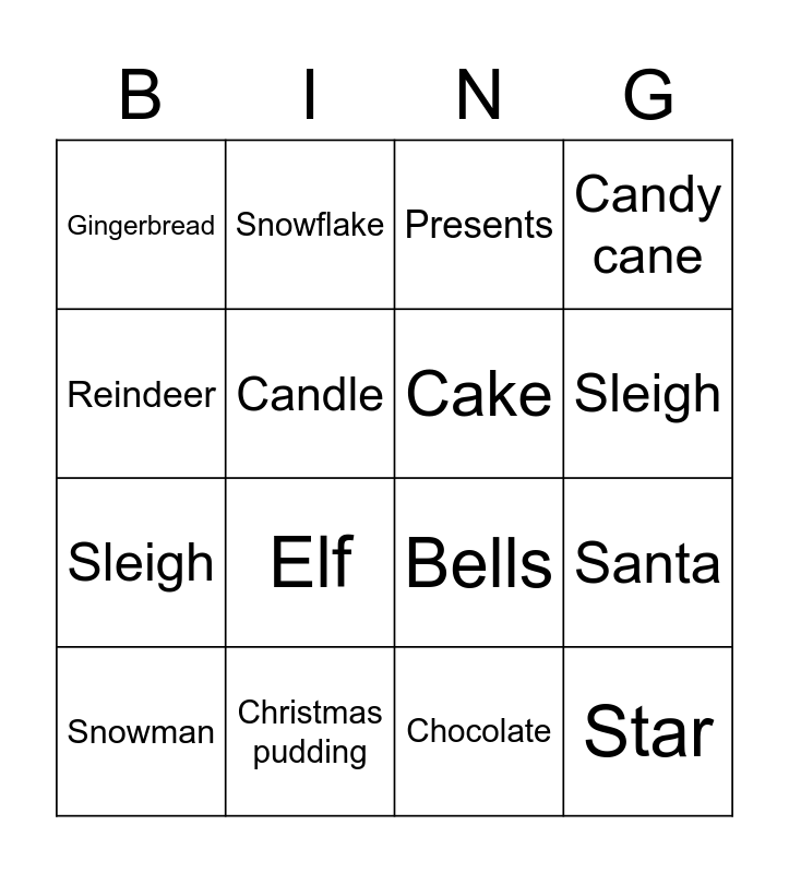 This bingo card has 20 words: Santa, Stocking, Presents, Christmas tree, Snowman, Reindeer, Christmas pudding, Gingerbread, Sleigh, Snowflake, Elf, Bells, Candle, Star, Cake, Angel, Sleigh, Candy cane, Chocolate and Ribbon.
