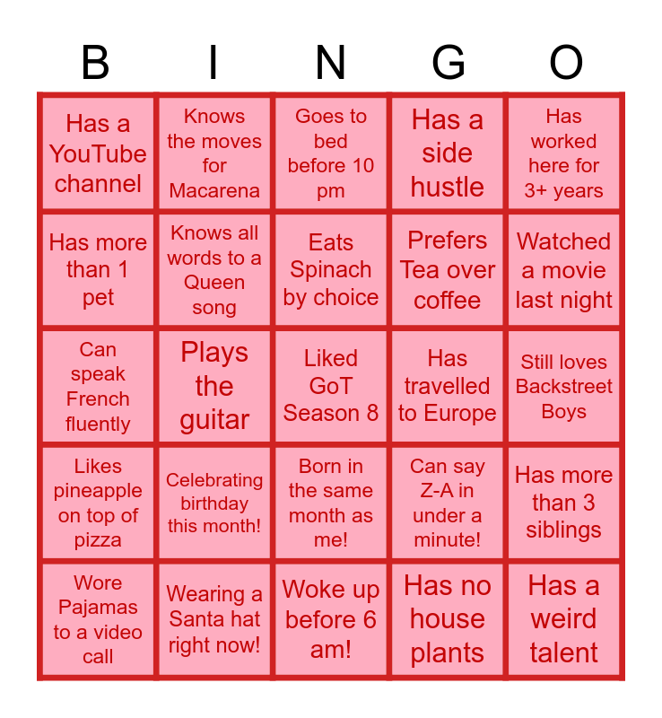 This bingo card has 25 words: Celebrating birthday this month!, Woke up before 6 am!, Eats Spinach by choice, Wore Pajamas to a video call, Has worked here for 3+ years, Has a YouTube channel, Has more than 1 pet, Knows the moves for Macarena, Has travelled to Europe, Born in the same month as me!, Prefers Tea over coffee, Can speak French fluently, Can say Z-A in under a minute!, Has more than 3 siblings, Knows all words to a Queen song, Has a weird talent, Still loves Backstreet Boys, Goes to bed before 10 pm, Watched a movie last night, Plays the guitar, Liked GoT Season 8, Wearing a Santa hat right now!, Likes pineapple on top of pizza, Has a side hustle and Has no house plants.