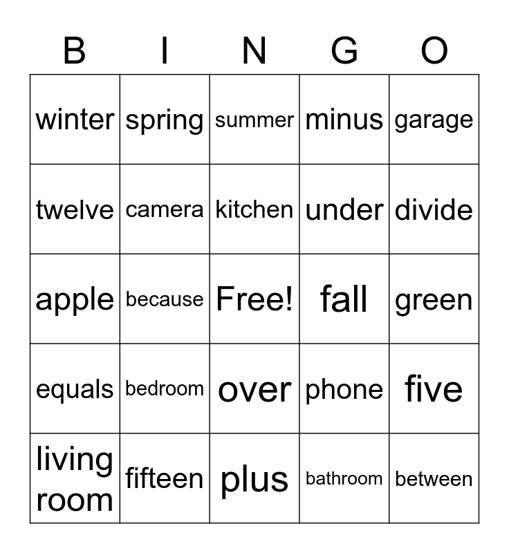 This bingo card has a free space and 24 words: living room, bedroom, kitchen, bathroom, garage, winter, spring, summer, fall, green, apple, camera, phone, five, twelve, fifteen, plus, minus, divide, equals, because, over, under and between.
