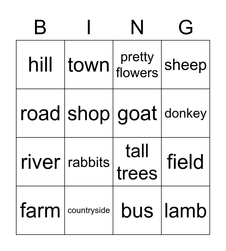 This bingo card has 16 words: countryside, field, pretty flowers, hill, river, town, tall trees, bus, road, shop, farm, sheep, rabbits, donkey, goat and lamb.