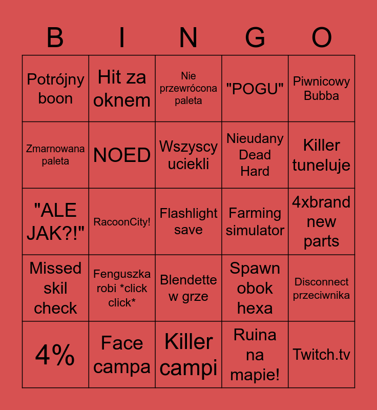 This bingo card has 28 words: Disconnect przeciwnika, DS w szafce, Nieudany Dead Hard, Ruina na mapie!, Zmarnowana paleta, Nie przewrócona paleta, Hit za oknem, Missed skil check, Farming simulator, 4%, "ALE JAK?!", "POGU", Face campa, Killer campi, Killer tuneluje, Mori, Fenguszka robi *click click*, NOED, Wszyscy uciekli, Blendette w grze, Potrójny boon, Twitch.tv, Flashlight save, RacoonCity!, 4xbrand new parts, Spawn obok hexa, Piwnicowy Bubba and 360.