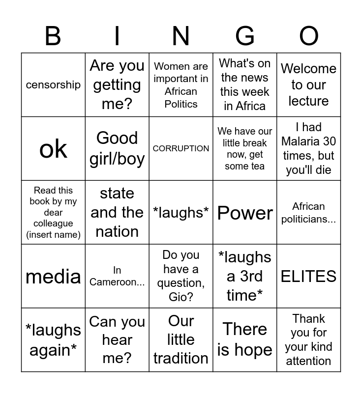 This bingo card has 25 words: In Cameroon..., Our little tradition, CORRUPTION, *laughs again*, Welcome to our lecture, censorship, ok, Are you getting me?, Power, Do you have a question, Gio?, We have our little break now, get some tea, Read this book by my dear colleague (insert name), *laughs a 3rd time*, ELITES, Good girl/boy, Thank you for your kind attention, African politicians..., Women are important in African Politics, I had Malaria 30 times, but you'll die, state and the nation, *laughs*, Can you hear me?, media, What's on the news this week in Africa and There is hope.