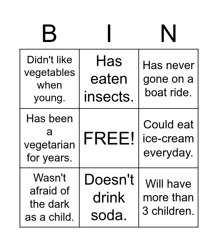 This bingo card has a free space and 24 words: Went to the movies last week., Has broken a limb., Doesn't drink soda., Didn't call his/her family in one month., Will have more than 3 children., Didn't like vegetables when young., Could eat ice-cream everyday., Has eaten insects., Would happily live on the beach., Listens to classical music., Has been camping., Can' swim., Would like to play musical instrument., Reads comics., Wasn't afraid of the dark as a child., Hasn't learned to drive yet., Will visit other cities in the USA., Has never gone on a boat ride., Would never try bungee jumping., Fell off the bike at least once., Hates sports., Has traveled alone before., Has been a vegetarian for years. and Can speak in more 3 languages..