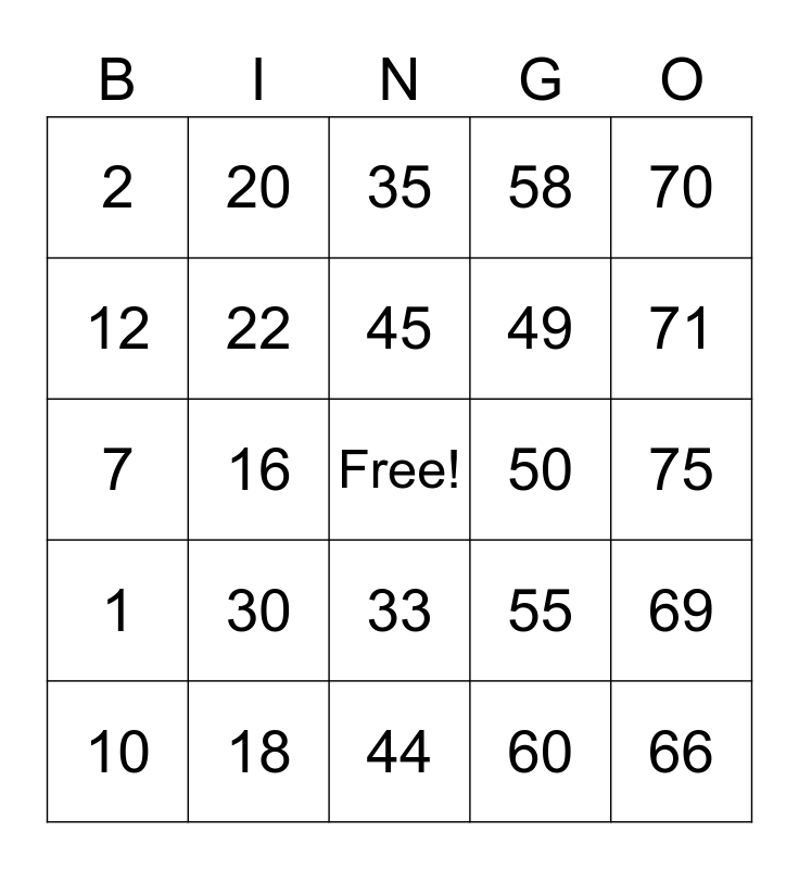 This bingo card has a free space and 24 words: 10, 30, 45, 60, 70, 2, 20, 35, 50, 75, 7, 22, 55, 69, 12, 18, 44, 58, 71, 1, 16, 33, 49 and 66.