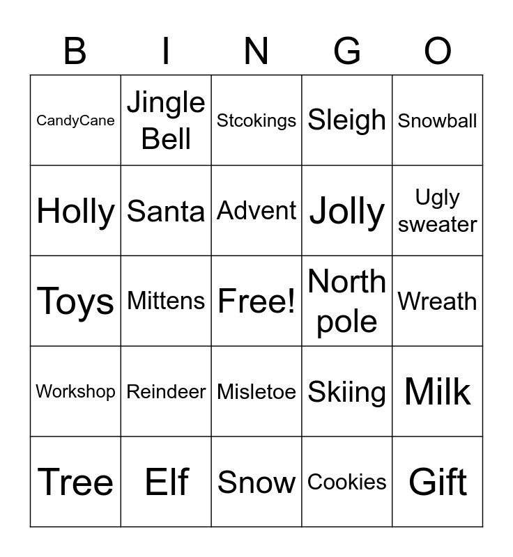 This bingo card has a free space and 29 words: Tree, Ornaments, Mittens, Snowman, CandyCane, Stcokings, Santa, Reindeer, North pole, Elf, Wreath, Gift, Snow, Cookies, Ugly sweater, Rudolph, Misletoe, Workshop, Snowball, Toys, Skiing, Sledding, Jolly, Holly, Sleigh, Jingle Bell, Milk, Advent and Chimney.