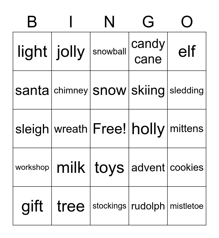 This bingo card has a free space and 24 words: milk, tree, snow, gift, elf, light, santa, jolly, holly, toys, skiing, sleigh, advent, cookies, chimney, rudolph, mittens, snowball, sledding, wreath, mistletoe, workshop, candy cane and stockings.