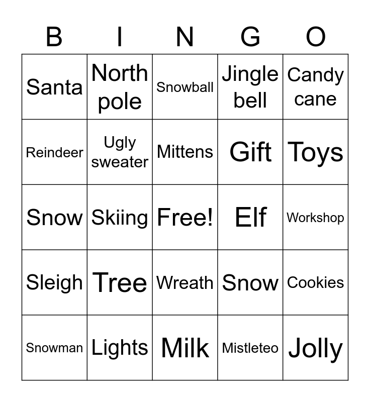This bingo card has a free space and 24 words: Tree, Lights, Mittens, Snowman, Candy cane, Santa, Reindeer, North pole, Elf, Wreath, Gift, Snow, Snow, Cookies, Ugly sweater, Mistleteo, Workshop, Snowball, Toys, Skiing, Jolly, Sleigh, Jingle bell and Milk.