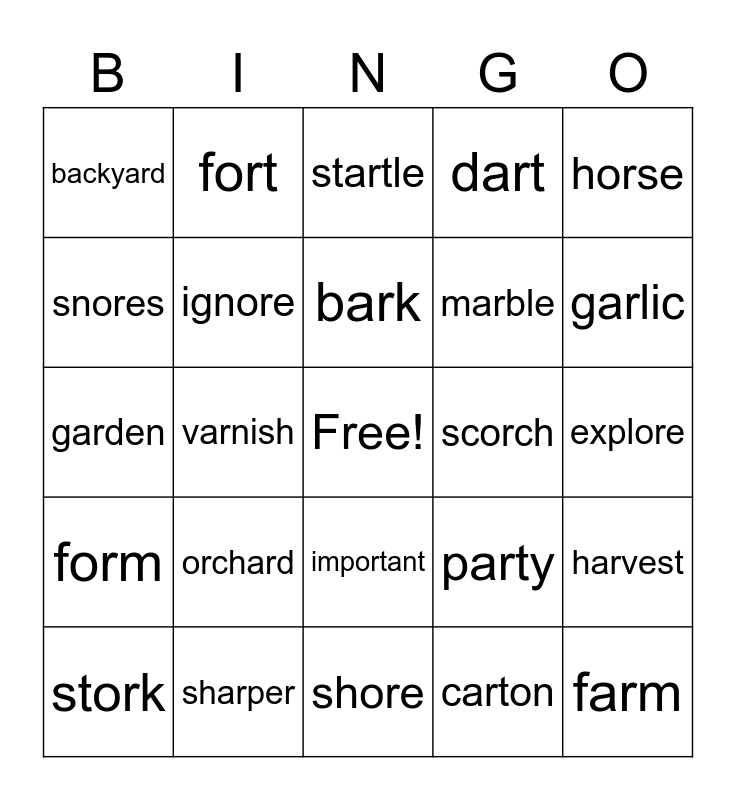This bingo card has a free space and 24 words: orchard, sharper, bark, stork, horse, backyard, snores, fort, scorch, important, marble, garden, party, harvest, ignore, carton, explore, startle, garlic, varnish, farm, form, dart and shore.