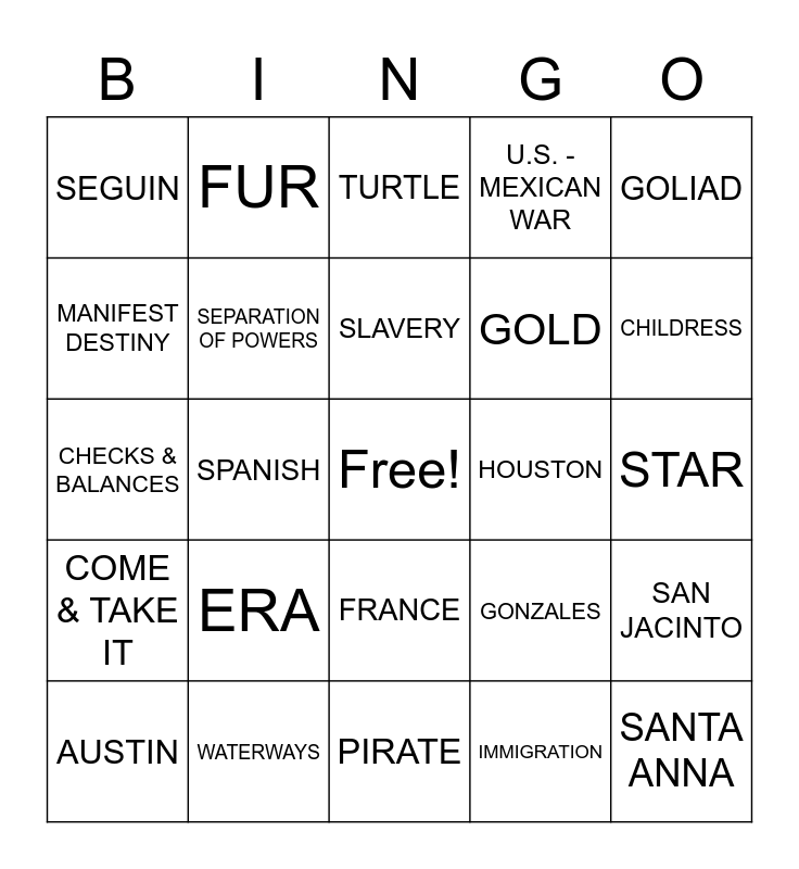 This bingo card has a free space and 24 words: ERA, WATERWAYS, SLAVERY, AUSTIN, GOLIAD, SEGUIN, MANIFEST DESTINY, FUR, HOUSTON, FRANCE, GOLD, CHECKS & BALANCES, GONZALES, SAN JACINTO, SEPARATION OF POWERS, IMMIGRATION, STAR, TURTLE, CHILDRESS, SPANISH, SANTA ANNA, COME & TAKE IT, U.S. - MEXICAN WAR and PIRATE.