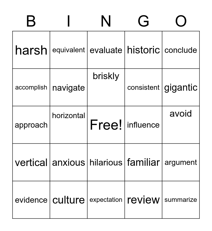 This bingo card has a free space and 24 words: anxious, culture, briskly, evidence, conclude, harsh, accomplish, equivalent, influence, hilarious, consistent, approach, familiar, argument, navigate, review, avoid, evaluate, gigantic, horizontal, summarize, vertical, historic and expectation.