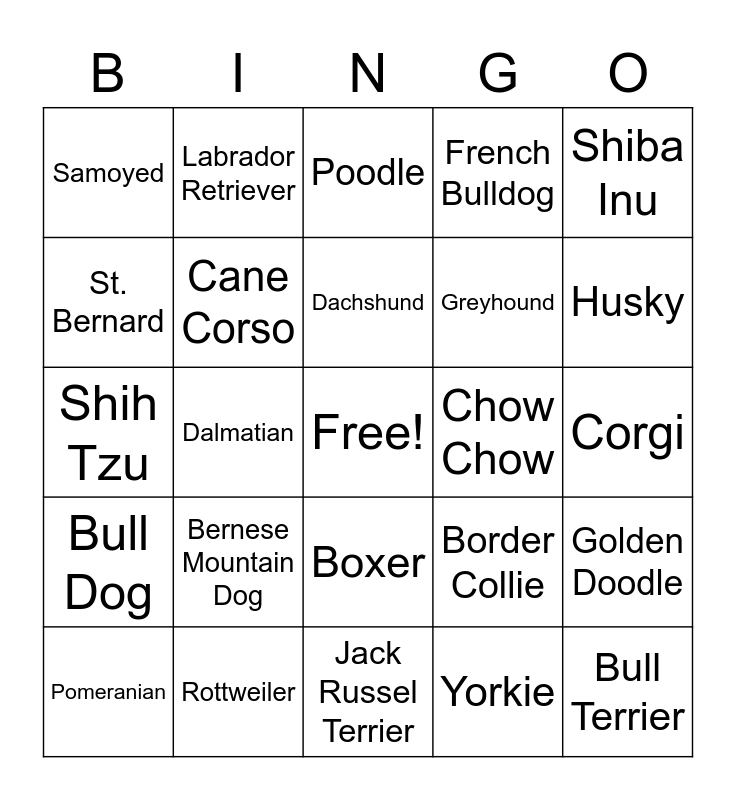This bingo card has a free space and 34 words: German Shepherd, Yorkie, Maltese, Pit Bull, Bull Dog, Cane Corso, Shiba Inu, Pomeranian, Labrador Retriever, Golden Retriever, Dachshund, Poodle, Pug, Dobermann, Chow Chow, Husky, Rottweiler, Shih Tzu, Bernese Mountain Dog, Border Collie, Boxer, Great Dane, Samoyed, Corgi, Jack Russel Terrier, Bull Terrier, French Bulldog, Maltipoo, Greyhound, St. Bernard, Newfoundland, Dalmatian, Golden Doodle and Shar Pei.