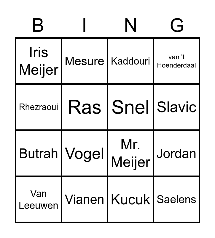 This bingo card has 16 words: Vianen, Jordan, Kaddouri, Iris Meijer, Butrah, Mesure, Mr. Meijer, Kucuk, Rhezraoui, Ras, Van Leeuwen, van 't Hoenderdaal, Vogel, Slavic, Snel and Saelens.