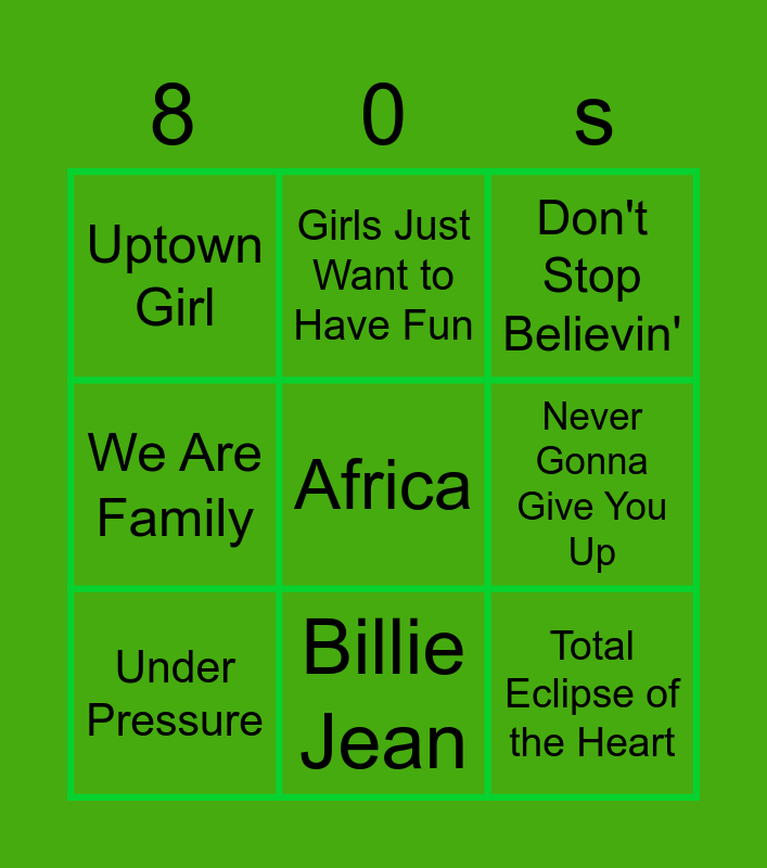 This bingo card has 12 words: My Sharona, Total Eclipse of the Heart, Africa, Never Gonna Give You Up, Girls Just Want to Have Fun, Don't Stop Believin', Billie Jean, Footloose, Uptown Girl, We Are Family, Under Pressure and Time After Time.