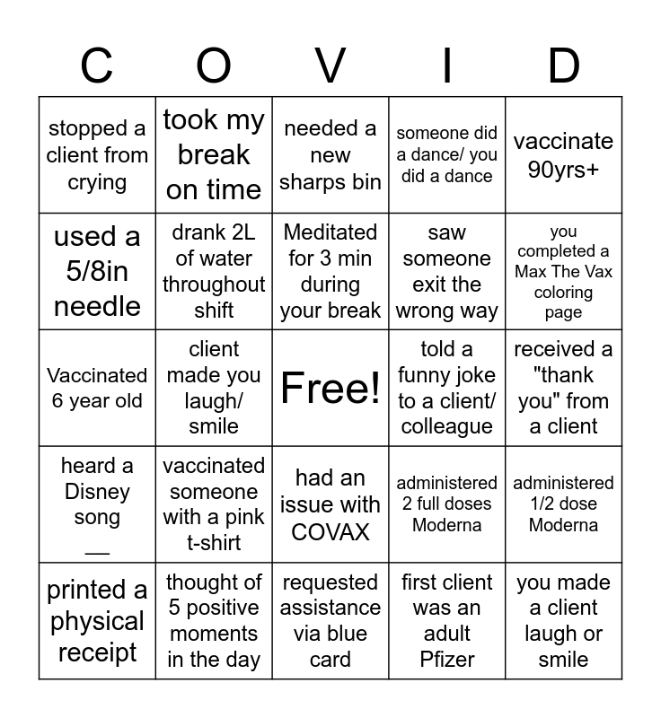 This bingo card has a free space and 24 words: vaccinated someone with a pink t-shirt, thought of 5 positive moments in the day, Meditated for 3 min during your break, printed a physical receipt, vaccinate 90yrs+, stopped a client from crying, used a 5/8in needle, took my break on time, told a funny joke to a client/ colleague, had an issue with COVAX, saw someone exit the wrong way, Vaccinated 6 year old, administered 2 full doses Moderna, administered 1/2 dose Moderna, drank 2L of water throughout shift, first client was an adult Pfizer, received a "thank you" from a client, needed a new sharps bin, you completed a Max The Vax coloring page, client made you laugh/ smile, you made a client laugh or smile, heard a Disney song __, someone did a dance/ you did a dance and requested assistance via blue card.