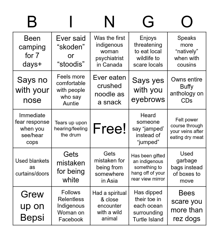 This bingo card has a free space and 43 words: Been chased by a rez dog, Bees scare you more than rez dogs, Flies scare you more than rez dogs, Grew up on Bepsi, Was cast on the quintessential native movie ‘Smoke Signals’, Has dipped their toe in each ocean surrounding Turtle Island, Was the first indigenous woman psychiatrist in Canada, Forgot someone was your cousin cause you have too many to keep track of, Speaks more “natively” when with cousins, Follows Relentless Indigenous Woman on Facebook, Enjoys threatening to eat local wildlife to scare locals, Heard someone say “jamped’ instead of “jumped”, Gets mistaken for being from somewhere in Asia, Gets mistaken for being white, Ate muktuk, Had a spiritual & close encounter with a wild animal, Has pets who know commands in your language, Immediate fear response when you see/hear cops, Seen any kind of wild bear, Owns entire Buffy anthology on CDs, Ever said “skoden” or “stoodis”, Has/had native pattern steering wheel cover, Gone searching for sasquatch, Been camping for 7 days+, People love your bannock, Felt power course through your veins after eating dry meat, You have the urge to bead everything in your house, Your friends treat you like you’re Bear Grylls or Mantracker, Has been gifted an indigenous something to hang off of your rear view mirror, Used blankets as curtains/doors, Used a butter knife to lock your door, Used garbage bags instead of boxes to move, Has art items that double as weapons, Tears up upon hearing/feeling the drum, Still consider an ex’s family your family, Thought everyone said “bug dope” and not mosquito repellent, Watched all of Reservation Dogs, Ever eaten crushed noodle as a snack, Says no with your nose, Says yes with you eyebrows, Points with lips, Feels more comfortable with people who say Auntie and Own at least 10 pairs of beaded earrings.
