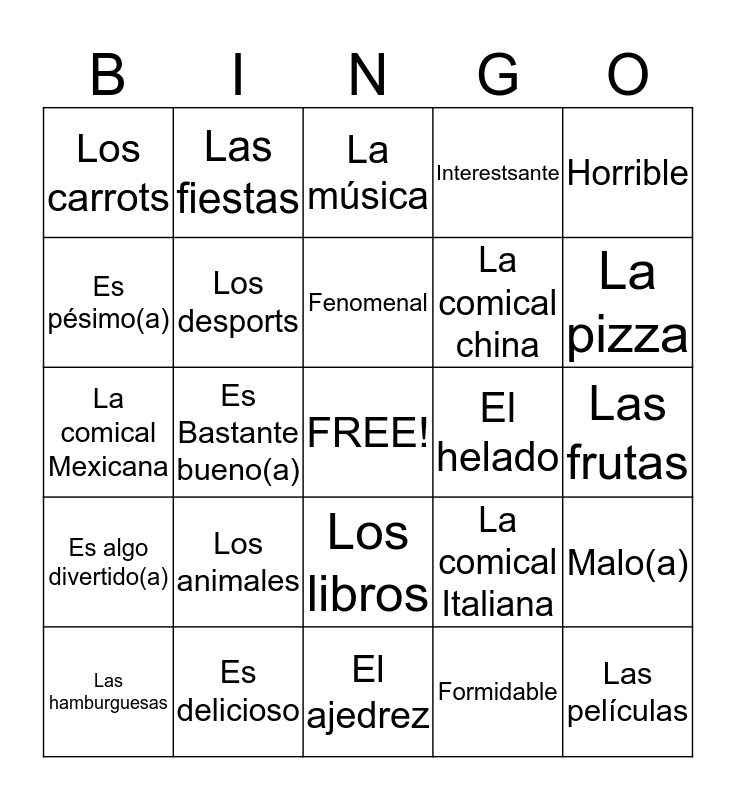 This bingo card has a free space and 24 words: Los animales, Es delicioso, Fenomenal, Las hamburguesas, Horrible, Los carrots, Es pésimo(a), Las fiestas, El helado, Los libros, La comical china, La comical Mexicana, La comical Italiana, Malo(a), Los desports, Formidable, Las frutas, La música, La pizza, Es Bastante bueno(a), Las películas, Es algo divertido(a), Interestsante and El ajedrez.