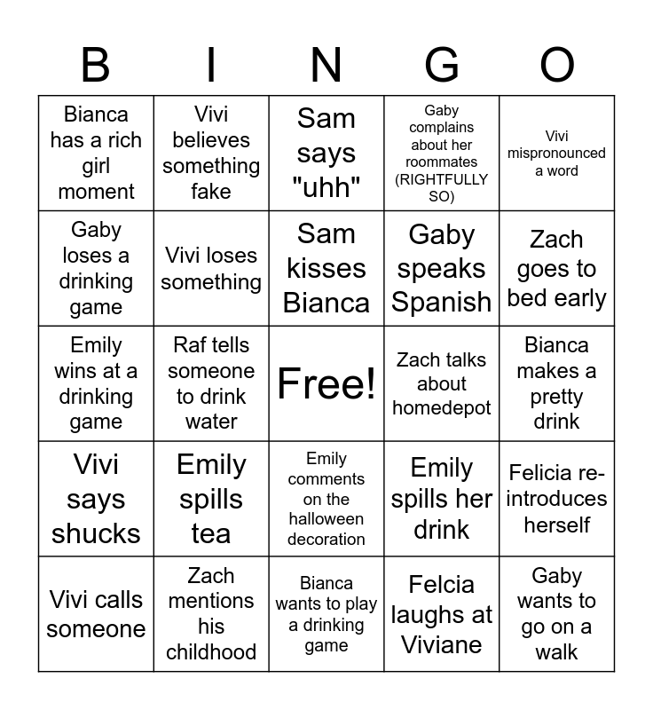 This bingo card has a free space and 33 words: Raf mentions his potential lovers, Raf talks about Nespresso, Raf tells someone to drink water, Raf mentions his plants are dying, Vivi says shucks, Vivi loses something, Vivi mispronounced a word, Vivi calls someone, Vivi believes something fake, Sam opens a Nestea, Sam kisses Bianca, Sam says "uhh", Sam puts on a hoodie, Zach adjust/wears his headband, Zach talks about homedepot, Zach goes to bed early, Zach mentions his childhood, Emily wins at a drinking game, Emily spills tea, Emily spills her drink, Emily comments on the halloween decoration, Bianca cleans something of sams, Bianca has a rich girl moment, Bianca makes a pretty drink, Bianca wants to play a drinking game, Gaby wants to go on a walk, Gaby complains about her roommates (RIGHTFULLY SO), Gaby speaks Spanish, Gaby loses a drinking game, Felicia re-introduces herself, Felicia talks about her majo, Felcia laughs at Viviane and Felicia complains about work.