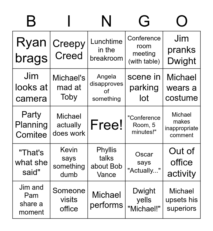This bingo card has a free space and 34 words: Jim looks at camera, Dwight yells "Michael!", Someone uses copier, Pam answers phone, "That's what she said", Michael's mad at Toby, Jim pranks Dwight, Jim and Pam share a moment, Creepy Creed, Stanley gets mad, Angela disapproves of something, Lunchtime in the breakroom, Someone uses the vending machine, Michael distracts someone from working, "Conference Room, 5 minutes!", Michael wears a costume, Someone visits office, Party Planning Comitee, Kevin says something dumb, Oscar says "Actually...", Phyllis talks about Bob Vance, Kelly rambles, Ryan brags, Michael makes inappropriate comment, Michael performs, Michael upsets his superiors, Conference room meeting (with table), Conference room meeting (chairs only), scene in parking lot, Jim looks at camera, Pam manages Michael, Michael actually does work, Out of office activity and warehouse scene.