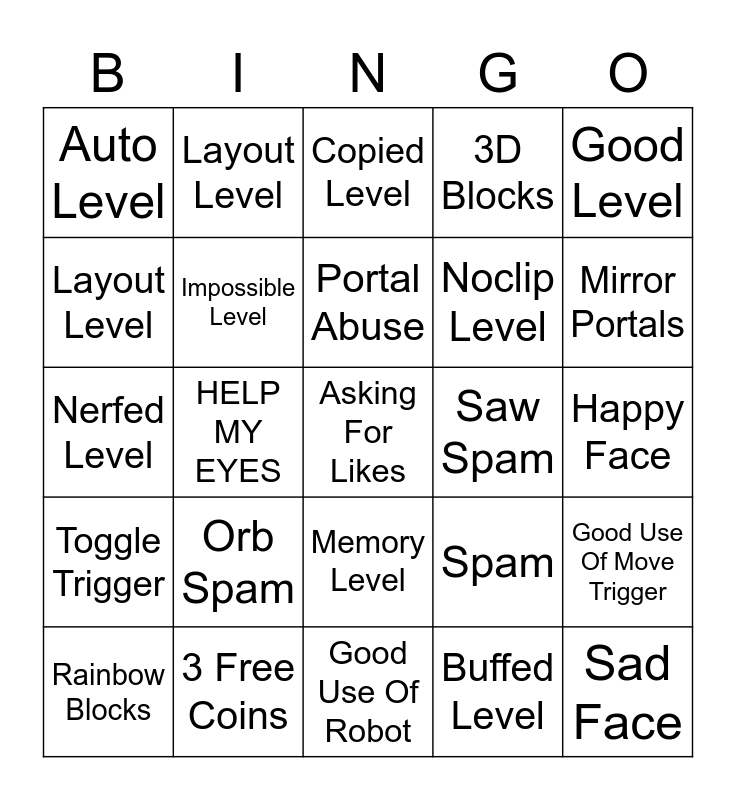 This bingo card has a free space and 24 words: Orb Spam, 3 Free Coins, Portal Abuse, Rainbow Blocks, Good Level, Auto Level, Layout Level, Layout Level, Saw Spam, Memory Level, Noclip Level, Nerfed Level, Spam, Good Use Of Move Trigger, Impossible Level, Buffed Level, Happy Face, Copied Level, Mirror Portals, HELP MY EYES, Sad Face, Toggle Trigger, 3D Blocks and Good Use Of Robot.