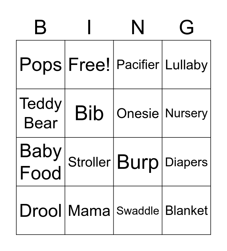This bingo card has 20 words: Diapers, Crib, Pacifier, Bottle, Drool, Teddy Bear, Mama, Pops, Baby Food, Free!, Stroller, Burp, Bib, Blanket, Onesie, Nap, Nursery, Lullaby, Swaddle and High Chair.