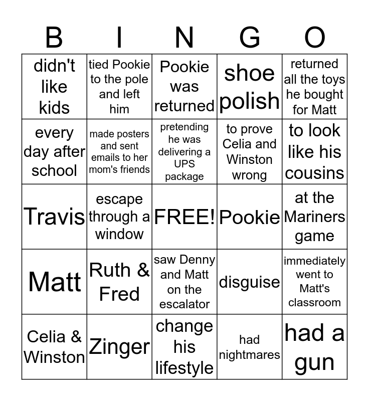 This bingo card has a free space and 24 words: Ruth & Fred, Zinger, pretending he was delivering a UPS package, Celia & Winston, returned all the toys he bought for Matt, didn't like kids, every day after school, tied Pookie to the pole and left him, Pookie, saw Denny and Matt on the escalator, to prove Celia and Winston wrong, Travis, disguise, immediately went to Matt's classroom, made posters and sent emails to her mom's friends, had nightmares, at the Mariners game, Pookie was returned, to look like his cousins, escape through a window, had a gun, Matt, shoe polish and change his lifestyle.