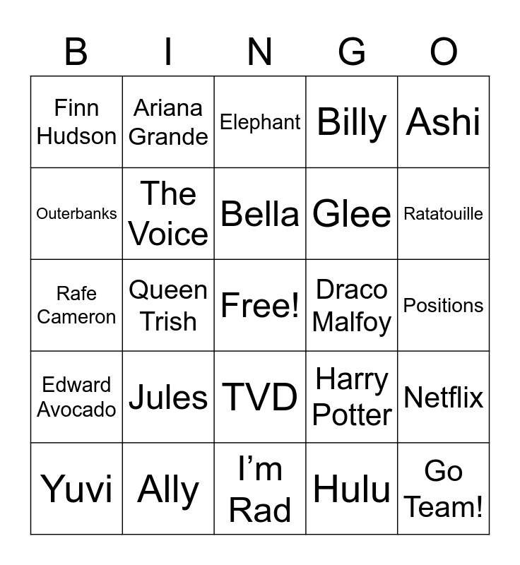 This bingo card has a free space and 24 words: Jules, Ally, Bella, Yuvi, Ashi, Finn Hudson, Outerbanks, Ariana Grande, Draco Malfoy, TVD, Glee, Rafe Cameron, Harry Potter, Netflix, The Voice, Hulu, Positions, Elephant, Ratatouille, Queen Trish, Go Team!, Edward Avocado, Billy and I’m Rad.