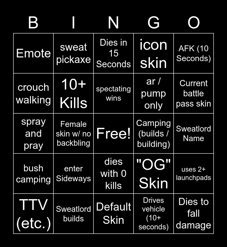 This bingo card has a free space and 29 words: TTV (etc.), Dies to Storm, Female skin w/ no backbling, BM, Emote, Dies in 15 Seconds, 10+ Kills, enter Sideways, Camping (builds / building), Sweatlord builds, Sweatlord Name, Dies to fall damage, Default Skin, Drives vehicle (10+ seconds), Current battle pass skin, Marvel/DC Skin, dies with 0 kills, bush camping, AFK (10 Seconds), spray and pray, "OG" Skin, superhero skin, ar / pump only, crouch walking, icon skin, sweat pickaxe, uses 2+ launchpads, spectating wins and bot.