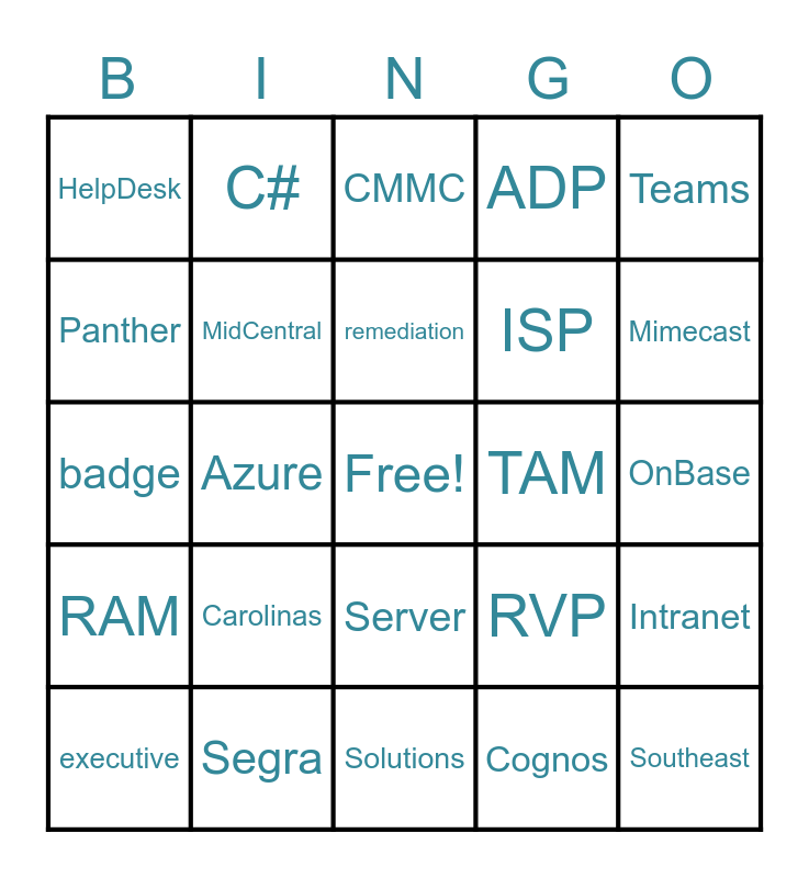This bingo card has a free space and 70 words: Hyland, OnBase, CostPoint, FirstNet, Segra, Zoho, ADP, TMS, Teams, SharePoint, Intranet, Connections, HelpDesk, CMMC, ALERTS, Azure, Server, ISP, Camera, RAM, TAM, RVP, Mimecast, VPN, KnowBe4, OneDrive, Zoom, PowerBI, Cognos, SQL, C#, website, hazmat, rail, marine, Java, HQ, Triangle, TechOps, Panther, Horton, Carolinas, Southeast, MidAtlantic, MidWest, MidCentral, executive, process, LucidChart, Confluence, Jira, Ticket, Applications, Engineering, Solutions, asbestos, remediation, security, vac truck, tank cleaning, badge, integration, data, report, dashboard, cardigan, Deltek, consultant, developer and contractor.