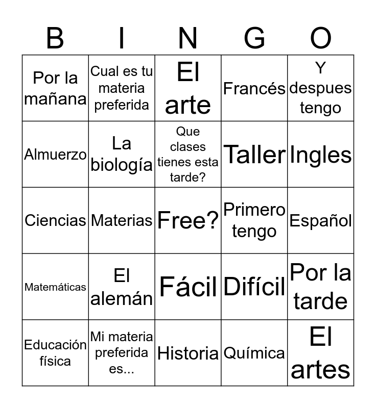 This bingo card has a free space and 24 words: El alemán, Mi materia preferida es..., Que clases tienes esta tarde?, Educación física, Y despues tengo, Por la mañana, Almuerzo, Cual es tu materia preferida, Primero tengo, Fácil, Taller, Ciencias, Difícil, Por la tarde, La biología, Química, Español, El arte, Ingles, Materias, El artes, Matemáticas, Francés and Historia.