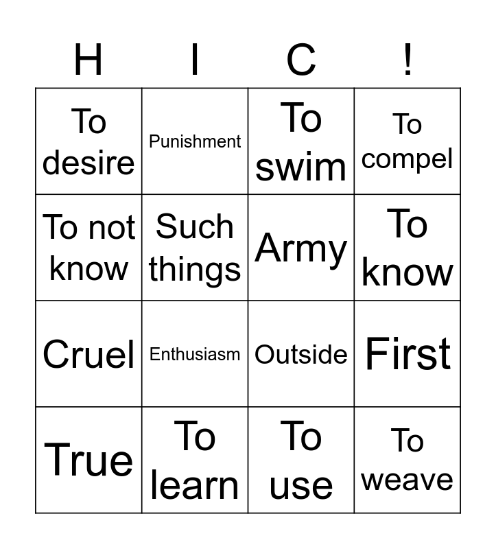 This bingo card has 20 words: First, To dare, To swim, To drive back, True, To not know, To learn, To desire, Cruel, Punishment, Enthusiasm, Outside, Such things, To weave, Army, Enemy, To know, To compel, To use and To increase.