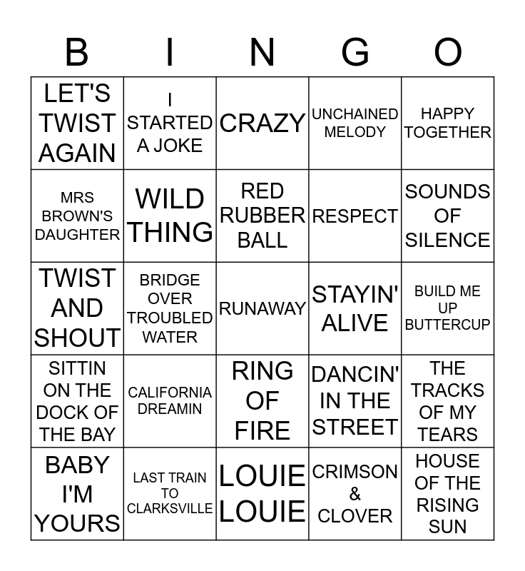 This bingo card has a free space and 24 words: CALIFORNIA DREAMIN, LAST TRAIN TO CLARKSVILLE, RED RUBBER BALL, BABY I'M YOURS, HAPPY TOGETHER, LET'S TWIST AGAIN, MRS BROWN'S DAUGHTER, I STARTED A JOKE, STAYIN' ALIVE, RING OF FIRE, RESPECT, TWIST AND SHOUT, DANCIN' IN THE STREET, THE TRACKS OF MY TEARS, WILD THING, CRIMSON & CLOVER, BUILD ME UP BUTTERCUP, CRAZY, SOUNDS OF SILENCE, BRIDGE OVER TROUBLED WATER, HOUSE OF THE RISING SUN, SITTIN ON THE DOCK OF THE BAY, UNCHAINED MELODY and LOUIE LOUIE.