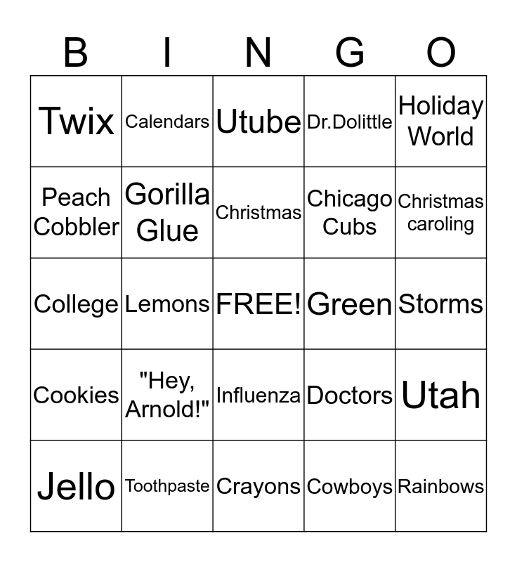 This bingo card has a free space and 24 words: "Hey, Arnold!", Toothpaste, Christmas, Jello, Holiday World, Twix, Peach Cobbler, Calendars, Green, Influenza, Chicago Cubs, College, Doctors, Utah, Gorilla Glue, Cowboys, Storms, Utube, Christmas caroling, Lemons, Rainbows, Cookies, Dr.Dolittle and Crayons.