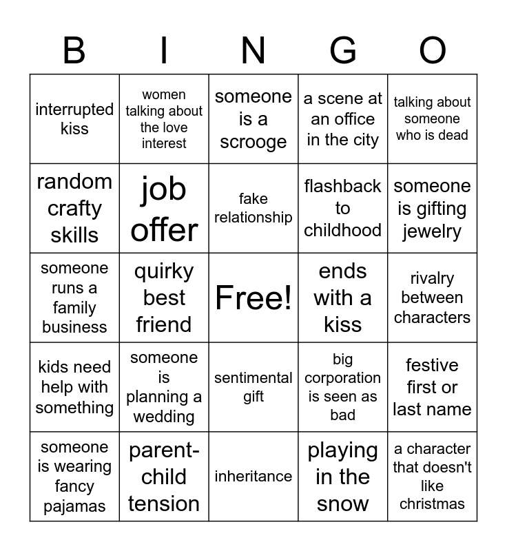 This bingo card has a free space and 102 words: a big city boyfriend, mistletoe, talking about someone who is dead, a visit to a coffeeshop, bakery, or restaurant, children in Christmas costumes, a crisis at work, a concerned parent or grandparent, someone reveals their dream job, baked goods, a Christmas party, a tree lighting, telling a story about childhood, an actor from a tv series, shopping for Christmas tree, sentimental gift, love interests kiss, kids need help with something, a family heirloom, strolling through town, driving down snowy roads, the love interest is someone the lead doesn't know already, a main character goes through a breakup, weather interferes with plans, main character hasn't been home in awhile, a Christmas play or concert, someone is gifting jewelry, a scene at an office in the city, someone is planning a wedding, a home is decked out with decorations, multiple generations of a family get together, women talking about the love interest, someone is a scrooge, someone drives a truck, talking about santa, Santa, sentimental gift, sipping wine, small town christmas tradition, someone runs a family business, playing in the snow, someone is scheming, someone is wearing a flannel, someone is wearing fancy pajamas, cozy fire, main character doesn't like love interest at first, an old flame reappears, main character lost a parent, flashback to childhood, small town christmas events, making a family recipe, a former child star is starring, small town, random crafty skills, main character stressing about work, unexpectedly running into the love interest, a small town business is in trouble, it's snowing!, christmas shopping, cozy sweaters, a character that doesn't like christmas, decorating a christmas tree, a cute pet dog, carol singing, main character can't stay in town for long, airport scene, slow dance, character changes life purpose, rivalry between characters, quirky best friend, parent-child tension, character with no/few lines but always seems to be there, particular line keeps getting repeated, heartfelt speech from a main character, characters collide, hot cocoa, someone wears an apron, job offer, clumsy/accidental fall, workaholic, single parent, return to hometown, misunderstanding, wish/magic, ends with a kiss, ice skating/sledding/snowball fight, fake relationship, accidental kiss, mechanical issue/car trouble, aerial shot of city, blonde hair with beachy waves, average white boy, big corporation is seen as bad, side character is racial minority, weather interferes with plans, $ needed ASAP, inheritance, interrupted kiss, main character wears a red coat or dress, festive first or last name, set primarily in big city, Christmas is in the title and career that wouldn't make money in real life.