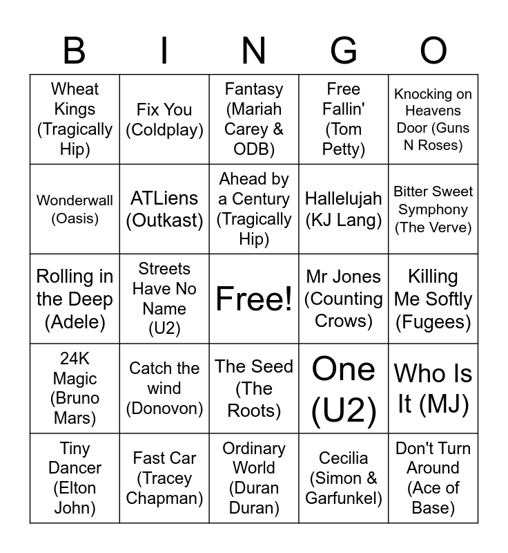 This bingo card has a free space and 24 words: Catch the wind (Donovon), Fast Car (Tracey Chapman), Ahead by a Century (Tragically Hip), Tiny Dancer (Elton John), Knocking on Heavens Door (Guns N Roses), Wheat Kings (Tragically Hip), Wonderwall (Oasis), Fix You (Coldplay), Mr Jones (Counting Crows), The Seed (The Roots), Hallelujah (KJ Lang), Rolling in the Deep (Adele), One (U2), Who Is It (MJ), ATLiens (Outkast), Cecilia (Simon & Garfunkel), Killing Me Softly (Fugees), Fantasy (Mariah Carey & ODB), Bitter Sweet Symphony (The Verve), Streets Have No Name (U2), Don't Turn Around (Ace of Base), 24K Magic (Bruno Mars), Free Fallin' (Tom Petty) and Ordinary World (Duran Duran).