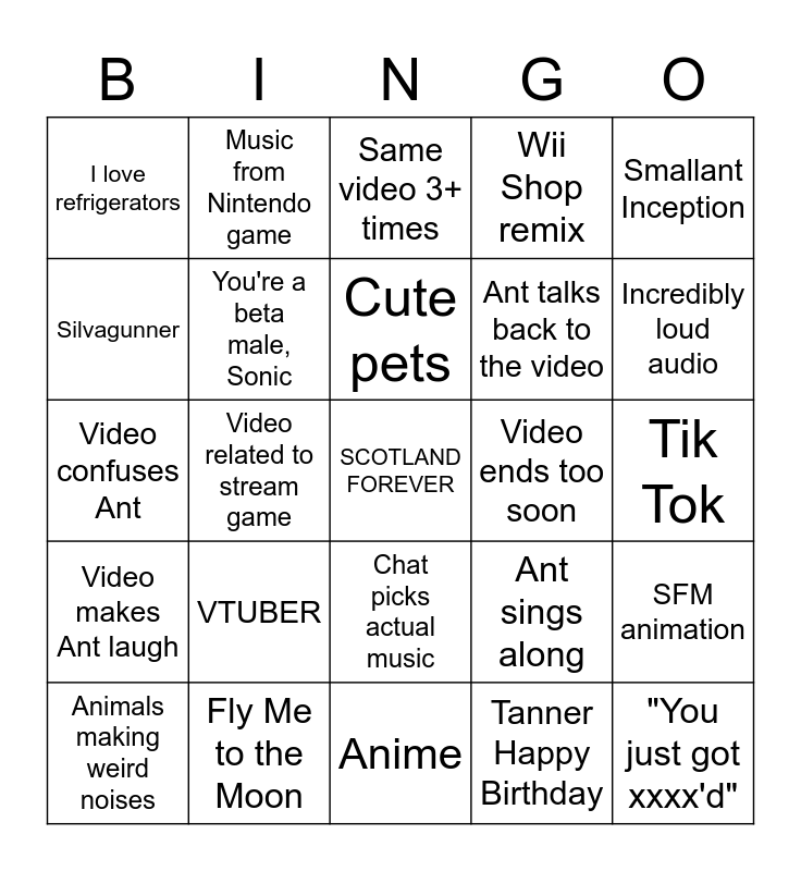 This bingo card has a free space and 24 words: VTUBER, Fly Me to the Moon, Cute pets, Animals making weird noises, Smallant Inception, I love refrigerators, Silvagunner, Music from Nintendo game, Video ends too soon, Chat picks actual music, Ant talks back to the video, Video confuses Ant, Ant sings along, SFM animation, You're a beta male, Sonic, Tanner Happy Birthday, Tik Tok, Same video 3+ times, Incredibly loud audio, Video related to stream game, "You just got xxxx'd", Video makes Ant laugh, Wii Shop remix and Anime.