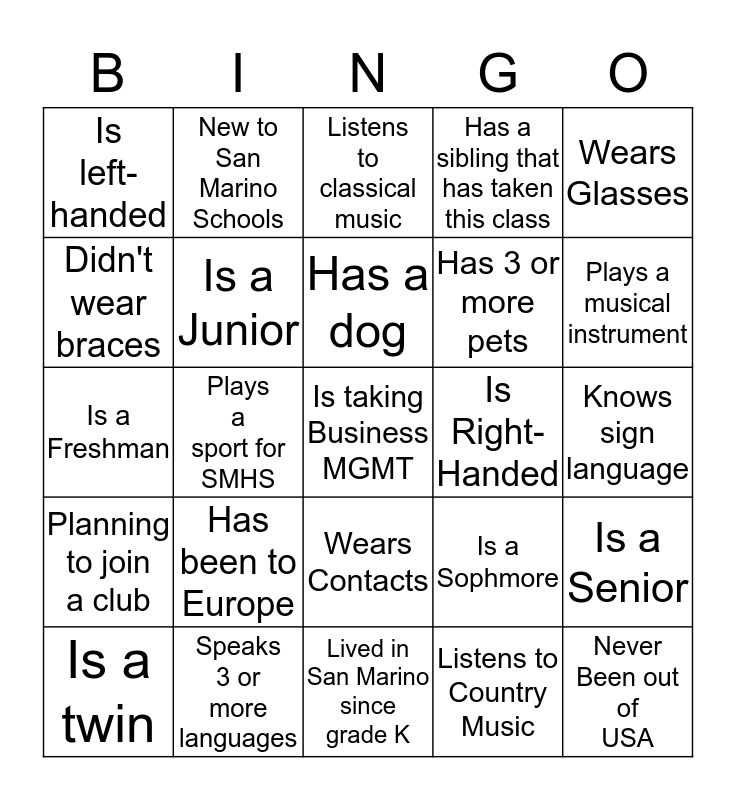 This bingo card has a free space and 24 words: Has been to Europe, Speaks 3 or more languages, Has a dog, Is a twin, Wears Glasses, Is left-handed, Didn't wear braces, New to San Marino Schools, Is Right-Handed, Wears Contacts, Has 3 or more pets, Is a Freshman, Is a Sophmore, Is a Senior, Is a Junior, Listens to Country Music, Knows sign language, Listens to classical music, Plays a musical instrument, Plays a sport for SMHS, Never Been out of USA, Planning to join a club, Has a sibling that has taken this class and Lived in San Marino since grade K.
