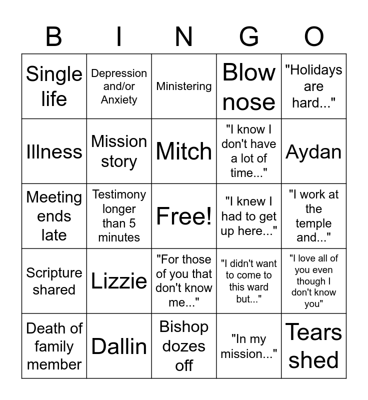 This bingo card has a free space and 24 words: Lizzie, Dallin, Mitch, Death of family member, "Holidays are hard...", Single life, Illness, Depression and/or Anxiety, "I knew I had to get up here...", "For those of you that don't know me...", "I know I don't have a lot of time...", Meeting ends late, "I didn't want to come to this ward but...", "I love all of you even though I don't know you", Mission story, "In my mission...", "I work at the temple and...", Ministering, Aydan, Testimony longer than 5 minutes, Tears shed, Scripture shared, Blow nose and Bishop dozes off.