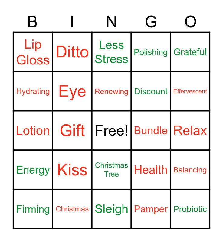 This bingo card has a free space and 30 words: Christmas, Mistletoe, Gift, Holiday, Lip Gloss, Less Stress, Eye, Christmas Tree, Bundle, Sleigh, Relax, Probiotic, Pamper, Giving, Effervescent, Turmeric, Health, Energy, Kiss, Grateful, Lotion, Stocking, Ditto, Discount, Hydrating, Polishing, Balancing, Firming, Renewing and Snack.