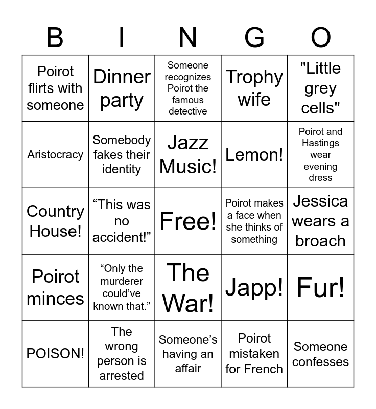 This bingo card has a free space and 29 words: POISON!, Inheritance is a motive, “This was no accident!”, More than one death, Poirot flirts with someone, Someone recognizes Poirot the famous detective, Somebody fakes their identity, “Only the murderer could’ve known that.”, Poirot makes a face when she thinks of something, The wrong person is arrested, Jessica wears a broach, Someone confesses, Someone’s having an affair, Poirot mistaken for French, Poirot and Hastings wear evening dress, Someone does 'a turn', The War!, Poirot minces, "Little grey cells", Country House!, Japp!, Hastings!, Lemon!, Aristocracy, Trophy wife, Dinner party, Fur!, Jazz Music! and Cousin Love!.